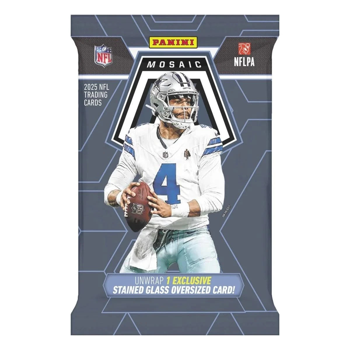 The 2025 Panini Mosaic Football collection draws on a 400-card set featuring 250 Base, 100 Base Rookies, 20 Base International Games, 20 Base Rookie Variations and 10 Base Hall of Fame. Also, unwrap exclusive Stained Glass Oversized cards. Includes: (8) Mosaic Football packs (6) Cards in each Mosaic Football pack (1) Stained Glass Oversized card